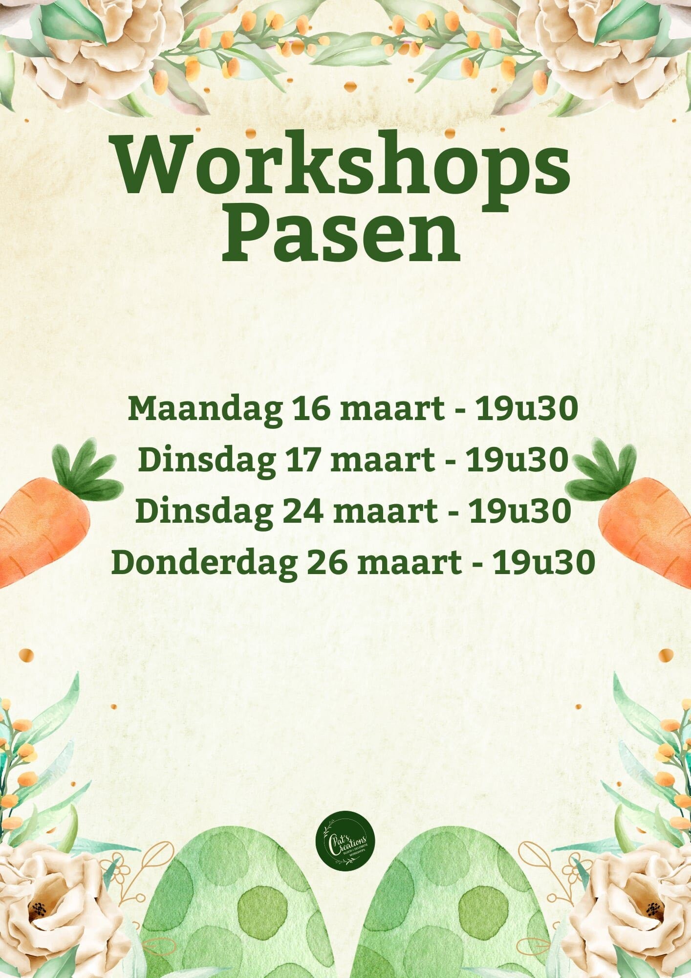 Ik ben Patricia Raijmakers en door mijn passie voor bloemschikken en interesse in decoratie, ben ik mijn eigen bedrijfje Pat's Creations gestart. Na jarenlang bloemschiklessen gevolgd te hebben leek het mij leuk om deze hobby uit te breiden door zelf workshops te gaan geven.